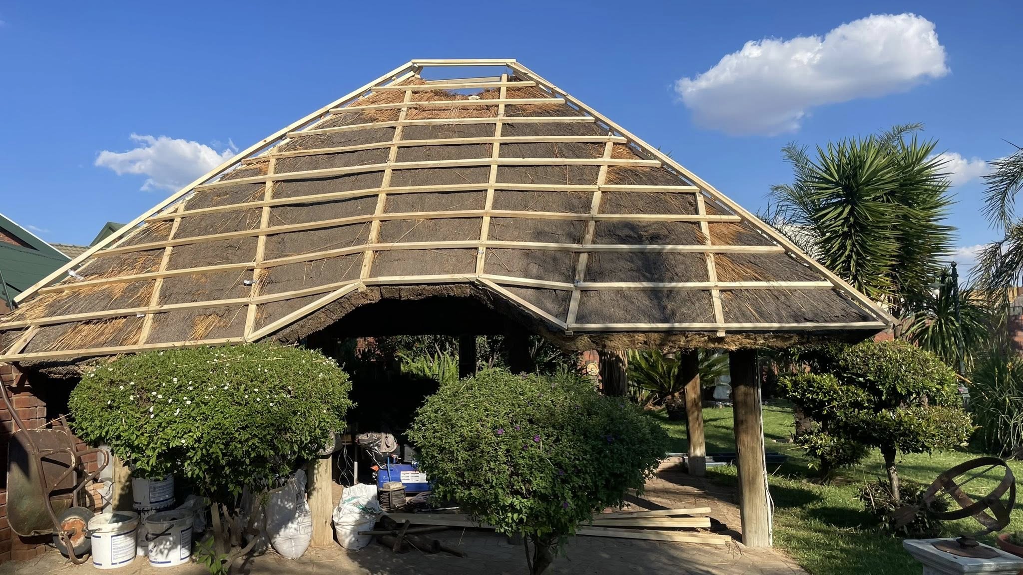 Our services include professional thatching, structure re-thatch, over-thatch, waterproofing for thatch leaks, fire protection treatments, lapas construction, tile installation, and Harvey thatch tile roofing. Whether restoring an aging roof or installing a brand-new structure, we ensure each project meets high standards of strength, safety, and visual appeal.